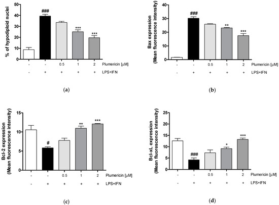 To further investigate the anti-apoptotic ability of plumericin, we evaluated the expression of Bax, a pro-apoptotic protein, and Bcl-2 and Bcl-xL, two anti-apoptotic proteins, by cytofluorimetric analysis. Our results indicated that plumericin (0.5–2 μM) significantly reduced Bax expression (p < 0.01 vs. LPS + IFN; Figure 4b) and increased Bcl-2 and Bcl-xL expression in LPS + IFN-stimulated IEC-6 (p < 0.01 vs. LPS + IFN; Figure 4c,d), at higher concentrations tested.