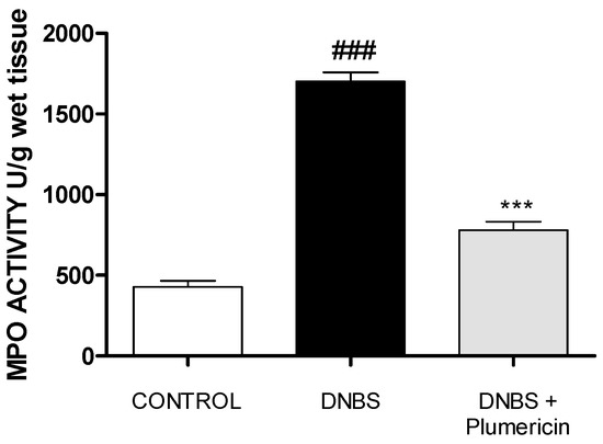 Effect of plumericin on myeloperoxidase (MPO) activity. Data are expressed as the mean ± S.E.M. of 10 mice for each group. ### denotes p < 0.001 vs. control group; *** denotes p < 0.001 vs. DNBS.