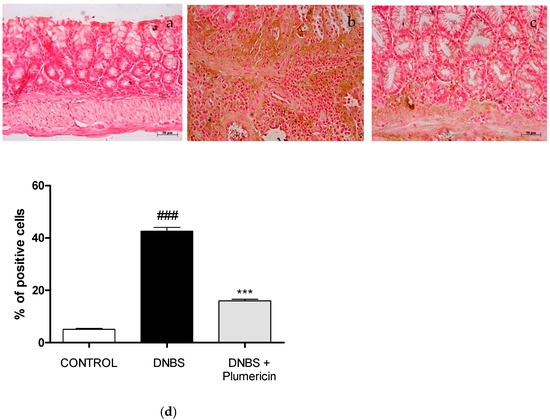 Effects of plumericin treatment on PAR formation (a–c) in colitis induced by DNBS. These data are also visible in graph of the percentage of total tissue area (d). Photographs are representative of all animals in each group. Data are expressed as the mean ± S.E.M. of 10 mice for each group. ### denotes p < 0.001 vs. control; *** denotes p < 0.001 vs. DNBS.