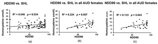 Relationship between serum homocysteine level (SHL) and drinking markers. (a) Significant positive association between SHL and heavy drinking days past 90 days (HDD90). (b) Significant positive association between SHL and HDD90 in all AUD females. (c) Significant positive association between SHL and number of drinking days past 90 days (NDD90) in all AUD females. Statistical significance was set at p ≤ 0.05. R2 denotes the effect of the relationship as an outcome of univariate linear regression.