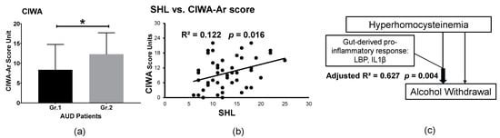 We evaluated alcohol withdrawal, one of the neurobehavioral domains of alcohol use disorder, in a sub-set analysis (n = 47) between the two groups (from Gr.1, n = 27; and from Gr.2, n = 20), for which these data were collected. CIWA was clinically not significant in Gr. 1(M ± SD: 8.1 ± 6.26) whereas in Gr.2, it was clinically significant (M ± SD: 12.3 ± 5.86) (Figure 2a). This elevation in CIWA in Gr.2 showed a statistical difference in the context of the pro-inflammatory response (covaried with interleukin 1β (IL1β)). SHL was significantly associated with alcohol withdrawal (Figure 2b) in Gr.2. A pathway analysis model showed that hyperhomocysteinemia and HDD90 along with LBP and IL1β showed a significant cumulative effect on alcohol withdrawal in Gr. 2 (Figure 2c) that was not evident in Gr.1.