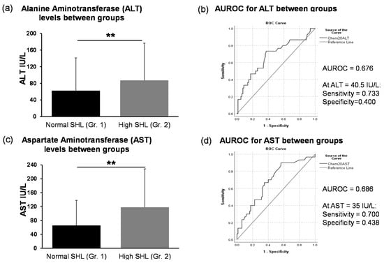Liver injury markers ALT and AST were both clinically and statistically significant in the Gr.2 patients, who also exhibited high homocysteine (Table 1, Figure 3). ROC curve analysis showed a fair level of true positivity in the differences in ALT and AST levels between the two groups. These subtle levels can be anticipated with early-stage ALD. SHL was very significantly associated with ALT and AST independently in all the study subjects (p ≤ 0.01). When we performed the association analyses within each group, we found that ALT and AST levels were significantly associated with SHL in Gr.1 only, i.e., not in Gr.2 (Data not plotted), suggesting that SHL and liver injury markers show corresponding levels when SHL was in the normal range only. Elevated SHL levels corresponded well with liver injury (Figure 3a,c); however, several pathways can be involved, thus association of SHL and liver injury should be investigated by including other interacting pathological factors (such as gut dysfunction and pro-inflammatory cytokines) apart from the heavy drinking patterns.