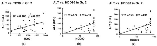Association of ALT and markers of heavy drinking in the elevated homocysteine group of AUD patients (Gr. 2). (a) Significant association of ALT and total drinks past 90 days (TD90). (b) Significant association of ALT and NDD90. (c) Significant association of ALT and HDD90. Statistical significance was set at p ≤ 0.05. R2 denotes the effect of the relationship as an outcome of univariate linear regression.