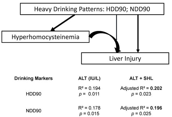 Gr.2 patients showed a significant association of ALT and several drinking markers independently. TD90 and NDD90 drinking markers were significantly associated with ALT (Figure 4a,b). To note, ALT showed the strongest association with HDD90 (Figure 4c). Importantly, SHL showed mediating effects on the drinking markers in predicting the liver injury marker ALT (Figure 5). HDD90 and NDD90 drinking patterns showed a significant albeit weak association with the liver injury marker ALT (2nd column, Table of Figure 5). The augmented effect sizes of HDD90 and NDD90 on ALT support the role of SHL in exacerbating the effects on the liver injury (3rd column of the table of Figure 5). We further explored the role of the gut-liver axis involved in the proinflammatory response and involvement of hyperhomocysteinemia and heavy drinking on ALT. In the pathological paradigm as illustrated in Figure 5, we found that by including the markers of gut dysfunction and proinflammatory response, (LBP, and IL1β), a significant and robust effect on ALT (adjusted R2 = 0.554 at p = 0.010) can be ascertained.