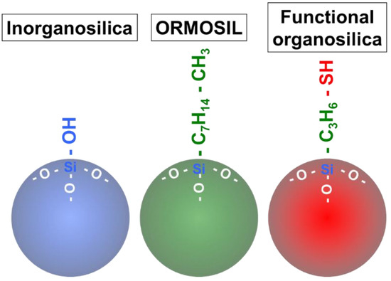 The alkoxysilanes, which are precursors of silica nanoparticles, contain carbon; however, the formed silica nanoparticles do not contain any carbon, due to hydrolysis. Therefore, these silica nanoparticles could be termed “inorganosilica nanoparticles”. Another type of silica nanoparticles has been prepared by various precursors. These silica nanoparticles are referred to herein as “organically modified silane (ORMOSIL) nanoparticles” and “functional organosilica nanoparticles”. These novel silica nanoparticles contain exposed interior and surface carbon, as well as organic and functional groups (Figure 1). ORMOSIL nanoparticles are defined as those which contain carbonaceous moieties (e.g., octyl and vinyl groups) [56,57] and do not contain any functional residues (e.g., amines or thiols). Functional organosilica nanoparticles contain functional groups such as thiol and epoxy groups [58,59,60,61]. Functional organosilica nanoparticles can be prepared from an organosilane reagent containing functional residues, such as (3-mercaptopropyl)trimethoxysilane (MPMS) or 2-(3,4-epoxycyclohexyl)ethyltrimethoxysilane (EpoMS). The prepared organosilica nanoparticles contain the functional residues, while chain alkanes originate from silane coupling agents in the interior and on the surface.