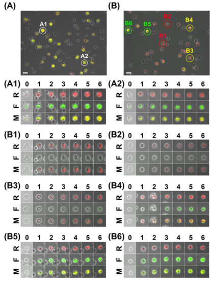 An in vitro imaging system to evaluate the stealth function of nanoparticles has been established using fluorescent organosilica nanoparticles [127]. Surface-functionalized organosilica nanoparticles with polyethylene glycol (PEG) were prepared, possessing a brush-type PEG layer. Time-lapse fluorescence imaging of mouse peritoneal macrophages by fluorescent thiol-organosilica nanoparticles demonstrated their cellular uptake. The single-cell quantitative analysis showed various patterns of uptake kinetics, indicating the heterogeneous functionality of macrophages. The cellar uptake level and kinetics of each macrophage were different, depending on the surface structure of the thiol-organosilica nanoparticles. A dual-particle administration study simulated the cellular uptake of nanoparticles possessing different surface structures. Macrophages incubated with Flu-PEG30K and Rho showed various cellular uptake patterns. The cellar uptakes of Flu-PEG30K and Rho into macrophage cells (Figure 2) were different. Many cells showed uptake of only Rho, while some cells showed uptake of both Rho and Flu-PEG30K. Many cells showed only Rho fluorescence (B1 and B2), and few cells showed fluorescence of both Flu and Rho (B3–B6). Single-cell imaging and analysis revealed various cellular uptake patterns and kinetics of bare and PEGylated nanoparticles. The PEGylated nanoparticles possessed a stealth function against most macrophages (i.e., PEG-sensitive macrophages). The authors proposed that PEG-insensitive macrophages, including PEG-resistant macrophages, are a novel concept. This concept is essential for understanding and regulating the immune responses against PEGylated nanoparticles. The stealth function against specific macrophages (i.e., PEG-insensitive macrophages) is under investigation.