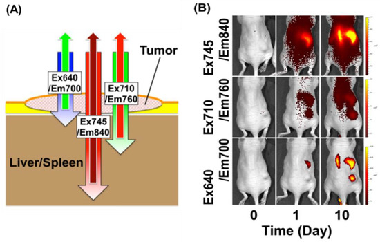 Depth-dependent NIR fluorescence in vivo imaging of a tumor. (A) A schematic illustration of depth-dependent NIR fluorescence imaging. Longer excitation and emission wavelengths, such as 745/840 nm (Ex745/Em850), can penetrate tissue very well and can detect particles in deeper sites, compared to shorter wavelengths (i.e., Ex710/Em760 and Ex640/Em700). (B) We administered totals of 2 mg (Day 1) and 6 mg (Day 10) of thiol-OS/IR820 into a mouse that had a subcutaneous xenograft tumor intravenously and observed the fluorescence using the in vivo imaging system under three excitation/emission wavelength conditions (Ex640/Em700 nm, Ex710/Em760 nm, and Ex745/Em840 nm). Reproduced with permission from Nakamura, M.; Hayashi, K.; Nakamura, J.; Mochizuki, C.; Murakami, T.; Miki, H.; Ozaki, S.; Abe, M. Near-Infrared Fluorescent Thiol-Organosilica Nanoparticles That are Functionalized with IR-820 and Their Applications for Long-Term Imaging of in Situ Labeled Cells and Depth-Dependent Tumor in Vivo Imaging. Chem. Mater. 2020, 32, 7201–7214 [106].