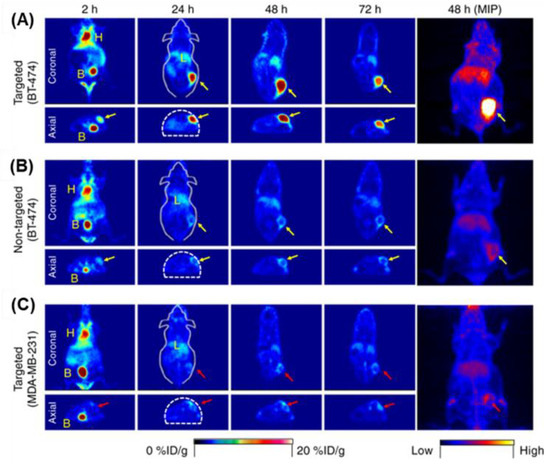 In vivo HER2-targeted PET imaging in xenograft breast cancer models. Serial coronal and axial tomographic PET images acquired at 2, 24, 48, and 72 h post intravenous injection of radiolabeled particle immunoconjugates in groups of tumor-bearing mice (N = 5 for each group), as follows: (A) targeted group, 89Zr-DFO-scFv-PEG-Cy5-C dots in BT-474 mice; (B) non-targeted group, 89Zr-DFO-Ctr/scFv-PEG-Cy5-C dots in BT-474 mice; and (C) targeted group, 89Zr-DFOscFv-PEG-Cy5-C dots in MDA-MB-231 mice. For each group, maximum intensity projection (MIP) images were also acquired at 48 h p.i. H, heart; B, bladder; L, liver. All BT-474 tumors are marked with yellow arrows, while all MDA-MB-231 tumors are marked with red arrows. Reproduced with permission from Chen, F.; Ma, K.; Madajewski, B.; Zhuang, L.; Zhang, L.; Rickert, K.; Marelli, M.; Yoo, B.; Turker, M.Z.; Overholtzer, M.; et al. Ultrasmall targeted nanoparticles with engineered antibody fragments for imaging detection of HER2-overexpressing breast cancer. Nat. Commun. 2018, 9, 1–11 [87].