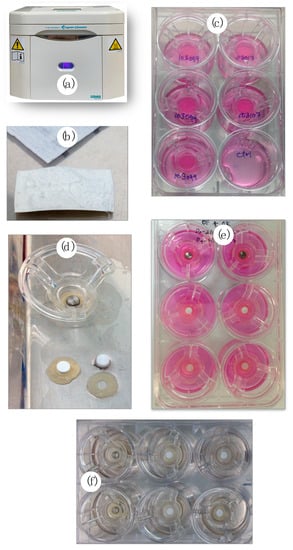 Steps in preparing the three-dimensional peri-implant mucosal model (a) the UV generating device; (b) membrane; (c) the membrane was cut into a round shape, fit in the insert with cells inoculated; (d) a punch hole was created in the middle of membrane and specimen inserted; (e) the tissue and specimens were incubated for up to ten days; (f) the tissues were washed with Dulbecco’s phosphate buffered saline before a permeability test was carried out.
