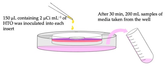 Tritiated water or the radioactive form of water (HTO) (3H, Packard, PerkinElmer Inc., Hopkinton, MA, USA), was used as a tracing agent to evaluate the permeability of the model. Permeability test was performed at room temperature on day 14 of the tissue models. The media in the insert were removed, and the inserts were washed and transferred to a new six-well plate containing 3 mL of new complete DMEM in each well (Figure 1f). An aliquot of 150 μL containing 2 μCi mL−1 of HTO was inoculated into each insert. After 30 min, a 200 mL of sample media in the well was obtained and labeled. The samples were mixed with 3.0 mL of scintillation cocktail (Ultima Gold™ XR, PerkinElmer Inc., Santa Clara, CA, USA), and the radioactivity of the samples (the measurement of tritiated water in media) was counted for 15 min using a liquid scintillation counter (Liquid Scintillation Analyzer Packard TRI-CARB Model 2700, Packard Instrument Company Inc., Meriden, CT, USA). The schematic description of the procedure is illustrated in Figure 2. The raw data obtained from the scintillation counter were the amount of HTO radioactivity that has penetrated through the tissue and material interface.