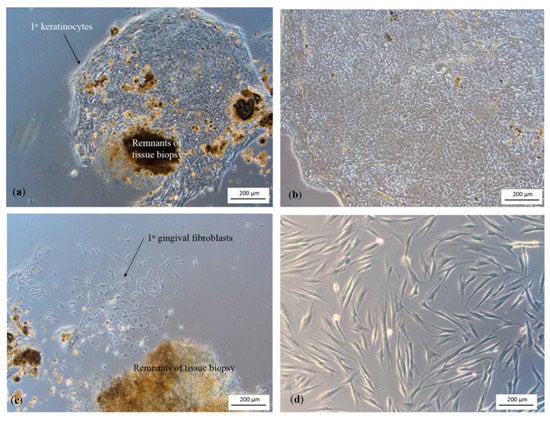 Primary cell growth was constantly monitored. Figure 4a–d show the images of primary HGK and HGF observed a few days following cell extraction. The black spots in the images were the remnants of tissue biopsies, which eventually detached from the flasks during media change.