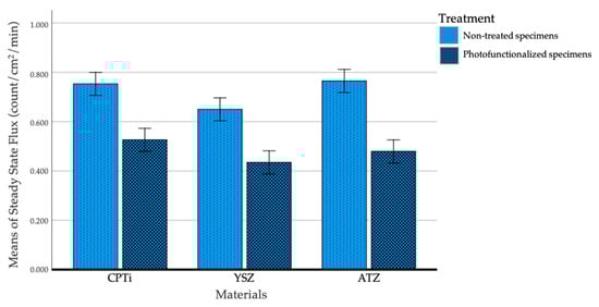 Figure 5 shows the steady-state flux of HTO through the tissue–material interface. The flux across the interface for all materials was statistically and significantly low following UV treatment (p < 0.001) without interaction among materials. When multiple comparisons test was performed, a significant difference was observed between YSZ and CPTi (p = 0.001) and between YSZ and ATZ (p = 0.004), but no significant difference was found between CPTI and ATZ (p = 0.727). Based on this result, YSZ exhibited the lowest permeability, as demonstrated by the low steady-state flux at a given time.