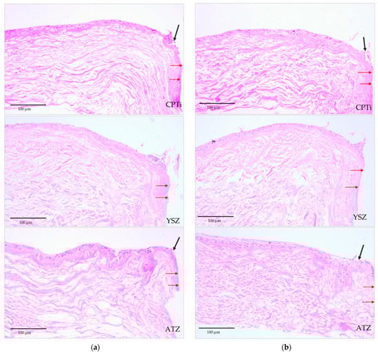 Tissue model following detachment of the disk (10× magnification); (a) UV-treated specimen–soft tissue interface and (b) nontreated specimen–soft tissue interface showing a few layers of epithelial cell formed and distortion of cell layers at the soft tissue–disk interface (shown in black arrows) for each type of materials. The soft tissue–specimen interface is indicated by red arrows.