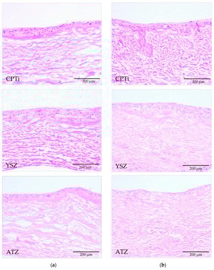 Based on previous reports, the commonly used in vitro techniques for the evaluation of the implant–soft tissue interaction are primarily based on monolayer culture of keratinocytes [] or fibroblasts [] on zirconia surfaces. Therefore, this study aimed to analyze the biological seal formed by connective tissue and epithelial attachment using a three-dimensional peri-implant mucosal model following photofunctionalization of selected dental implant abutment materials.
