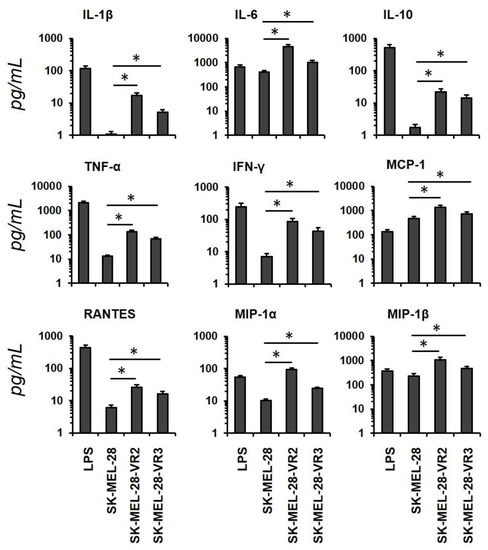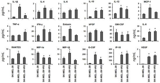Analysis of cytokines and chemokines secreted by SK-MEL-28 (sensitive, parental) and vemurafenib-resistant (VR2 and VR3) melanoma cells. Concentrations of the indicated analytes in conditioned media (CM) were quantified by multiplex immunoassay. Results are shown as mean ± SD of triplicate samples (statistical significance versus sensitive cell lines: * p < 0.01).