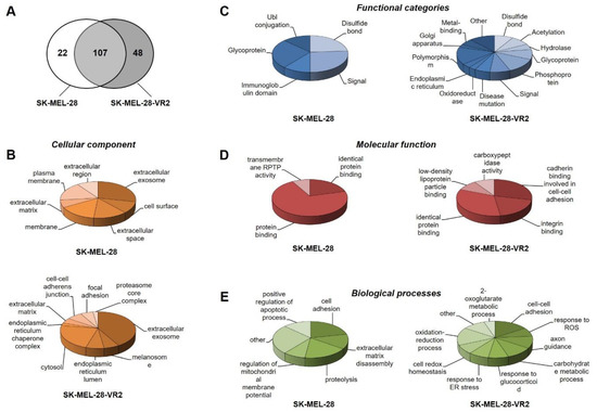 Secretome analysis of sensitive and vemurafenib-resistant melanoma cells. (A) The diagram illustrates common and differentially expressed (specific) proteins in SK-MEL-28 (sensitive) and SK-MEL-28-VR2 (vemurafenib-resistant) melanoma cells. The pie charts show Database for Annotation, Visualization, and Integrated Discovery (DAVID) classification of specific proteins based on (B) cellular component, (C) functional categories, (D) molecular functions, and (E) biological processes.