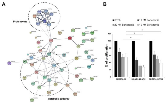 (A) The protein–protein interaction network of SK-MEL-28-VR2 differentially expressed proteins as predicted by the STRING software. The links between proteins represent possible interactions (line thickness indicates the strength of association). The two significant pathways were clustered. (B) Proliferation rate of melanoma cells left untreated (CTRL) or treated with the proteasome inhibitor bortezomib for 24 h. Data are expressed as % proliferation compared to the CTRL (100%) + SD of three independent experiments (statistical significance: * p < 0.01).