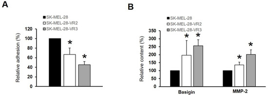 Our data clearly indicate that vemurafenib-resistant cells expressed more proteins related to cell adhesion (Figure 4), cell–cell and cell–matrix interactions (Figure 3), as well as higher levels of cytokines/chemokines able to modify the TME (Figure 1). These features are linked to a more disseminating phenotype of melanoma cells [27]. Accordingly, VR2 and VR3 cells showed a significant decrease of adhesion to reconstituted basement membrane (MG) (Figure 6A). Moreover, proteomic analysis (Table 1) revealed the presence of a transmembrane protein, namely CD147/basigin, in the resistant clone. CD147/basigin is highly expressed in metastatic melanoma and other malignant cells and promotes angiogenesis, tumor progression, and metastasis through the induction of matrix metalloproteinases (MMPs) [28]. Multiplex assay confirmed the presence of CD147/basigin (and MMP-2) in the SF-CM of both resistant clones (Figure 6B), while no differences were observed in CD147/basigin expression on the cell surface (data not shown).