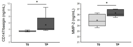 Plasma concentrations of CD147/basigin and MMP-2 in patients with BRAFV600-mutant metastatic cutaneous melanoma treated with either vemurafenib or vemurafenib plus cobimetinib. The median plasma levels of the indicated molecules in blood samples collected before the start of therapy (T0) were significantly lower than those collected at disease progression (TP). Statistical significance: * p < 0.05.