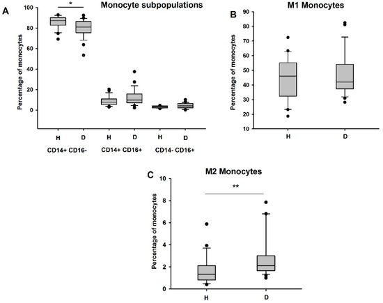 Then, assessing the expression of M1 (CD86 and CCR2) and M2 (CD206, CXCR3, and CD163) protein markers, we observed that, in comparison to the healthy subjects, HD patients showed an increased percentage of anti-inflammatory and immunosuppressive CD206+CXCR3+CD163+ M2 monocytes (p < 0.01), while the pro-inflammatory CD86+CCR2+ M1 monocyte population did not seem to be modified (p > 0.05) (Figure 1B,C). While analyzing the M1 or M2 predominance in the different monocyte subpopulations, we observed an increase in the M2 CD14+CD16+ monocyte subpopulation (p < 0.001), as well in the M2 CD14−CD16+ monocytes (p < 0.05), in HD patients as opposed to the controls. There was no significant difference in the M1 CD86+CCR2+ monocyte subpopulations (Figure 2A,B).