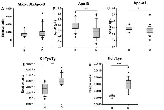 Comparison of the presence of myeloperoxidase-oxidized LDLs and their oxidation products in hemodialyzed patients and in controls. (A) Quantification of the plasma concentration of Mox-LDLs (ratio of Mox-LDLs/Apo-B), (B) Apo-B (g/L), (C) Apo-AI (g/L), and (D) chloro-tyrosine (ratio of chloro-tyrosine/tyrosine) in HD patients and healthy subjects. (E) Quantification of the plasma concentration of homocitrulline (ratio of homocitrulline/lysine). ** p < 0.01; *** p < 0.001.