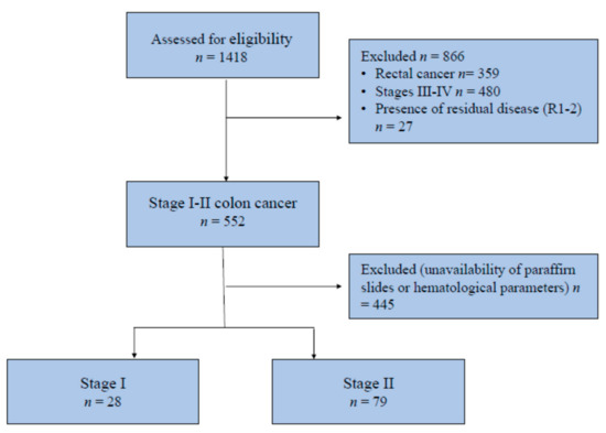 In total, 107 patients fulfilled the inclusion criteria and were included in the analysis (Figure 1). Twenty-eight (28) tumors (26.2%) were classified as TNM stage I and 79 (73.8%) as stage II. None of the patients received adjuvant chemotherapy.