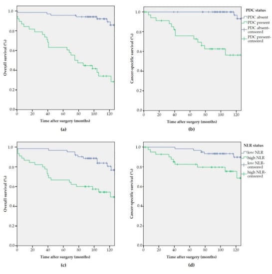 Kaplan–Meier estimates of overall survival (OS) and cancer-specific survival (CSS) according to PDC and NLR status: (a) OS according to PDC status (p < 0.001); (b) CSS according to PDC status (p < 0.001); (c) OS according to NLR status (p < 0.001); and (d) CSS according to NLR status (p = 0.011).