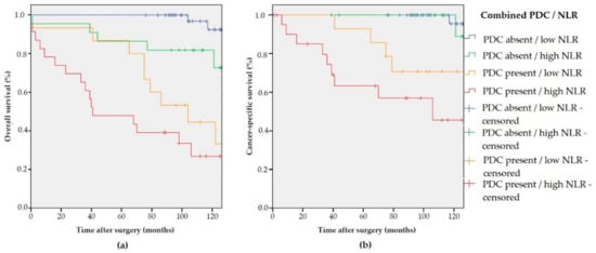 (a) Kaplan–Meier estimates of OS (p < 0.001) according to the combined PDC/NLR variable; and (b) Kaplan–Meier estimates of CSS (p < 0.001) according to the combined PDC/NLR variable.