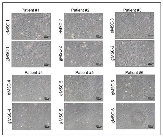 In this study, cultures of MSC originating from the biopsies of eutopic (eMSC) and ectopic (gMSC) endometrium of six patients with extragenital endometriosis were established and characterized. All cultures actively proliferated and consisted of cells with fibroblast-like morphology typical for MSC (Figure 1). At the same time, there were slight differences in cell shape, most evident in cultures from patient #5, where eMSC were more compact and less spread out than gMSC. It was probably due either to the different microenvironment in vivo or to distinct lineage descent of eMSC and gMSC. The established cell cultures were analyzed at 3–6 passages to compare their molecular markers and immunological properties.