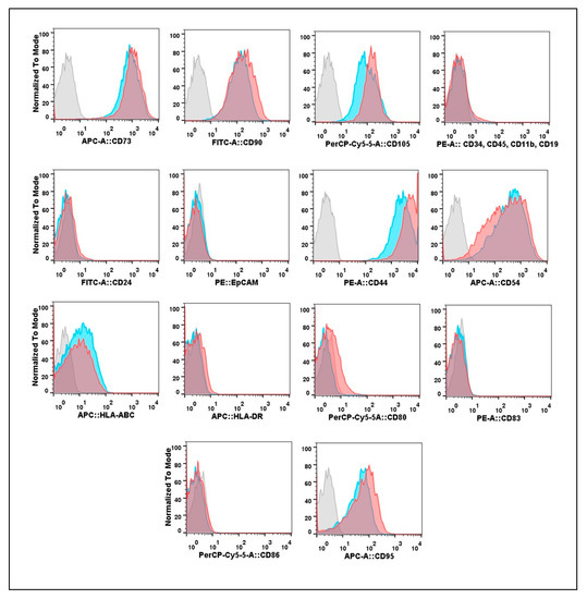 Expression of surface molecular markers on the mesenchymal stromal cell (MSC) cultures isolated from eutopic endometrium (eMSC) and endometrioid heterotopias (gMSC). Cell suspensions were treated with fluorochrome-conjugated monoclonal antibodies (MoAbs) and analyzed by flow cytometry X-axis—fluorescence intensity; Y-axis—normalized to mode percentage of cells. Blue curves—eMSC-5; red curves—gMSC-5; gray curves—gMSC-5 isotypic control. Since there are no significant differences between gMSC and eMSC isotypic controls, the eMSCs isotypic control histograms are not shown.