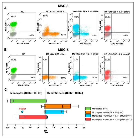 To assess the possible influence of the MSC cultures on the differentiation of DCs from monocytes, allogeneic monocytes from the peripheral blood of healthy donors were co-cultured with eMSC or gMSC. DCs differentiation was induced by adding recombinant GM-CSF and IL4 to the culture. The differentiation efficiency was assessed by flow cytometry using the monocyte marker CD14 and the DCs marker CD1a.