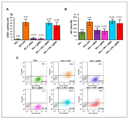 Effects of stromal cells from eutopic or ectopic endometrium upon the maturation of dendritic cells (DC) in vitro. Immature DCs were co-cultured with stromal cells of eutopic (eMSC) or ectopic (gMSC) endometrium with or without LPS (DCs/MSC ratio 1:1). After 2 days, co-culture cells were double stained with fluorescent MoAbs against CD83 and HLA-DR and analyzed by flow cytometry to evaluate the percentage of DCs expressing the maturation marker CD83 (A) and the level of HLA-DR expression (B). Processed data combining all measurements of five pairs of MSC co-cultures are presented (A,B). Whiskers show the SD. MFI—median fluorescence intensity measured in arbitrary units (a.u.). (C) The results of MSC-3 co-cultures (typical dot plots); gray dots denote isotype controls.