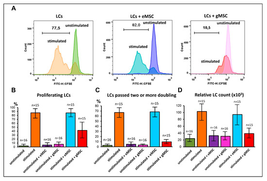 Effects of stromal cells from eutopic or ectopic endometrium upon the proliferation of T-lymphocytes in vitro. Lymphocytes (LCs) were stained with CFSE, stimulated to proliferate with “Dynabeads”, and co-cultured with stromal cells of eutopic (eMSC) or ectopic (gMSC) endometrium (LCs/MSC ratio 10:1). After 4 days in co-culture, the cells were analyzed by flow cytometry to evaluate CFSE distribution and relative LSs counts. (A) distribution of CFSE in MSC-6 co-cultures (typical histograms). (B–D) Processed data combining all the measurements of six pairs of the MSC co-cultures. (B) The percentage of proliferating LCs. (C) The percentage of proliferating LCs having passed two or more doubling. (D) Relative LCs counts. Whiskers represent SD.