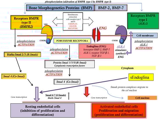 Important factors involved in angiogenesis, including those regulating the proliferation of vascular endothelial cells, are bone morphogenetic proteins (BMPs, Bone Morphogenetic Proteins) and their receptors (BMPRs, Bone Morphogenetics Receptors). These factors demonstrate the protective qualities of angiogenesis on endothelial cells against apoptosis, which favor their intensive proliferation and the remodeling of blood vessels, and also create conditions for the formation of a new vascular network []. In addition, they regulate the proliferation and differentiation of many cell types and also participate in immunological processes, which affect the migration and proliferative activity in the endothelial cells of blood vessels. This can facilitate the growth of endometrial cells and even their colonization in distant places in the body []. In the process of the formation and development of blood vessels, a special role is assigned to bone morphogenetic proteins, bone morphogenetic protein 2 (Bone Morphogenetic Protein 2, BMP-2) and bone morphogenetic protein 7 (Bone Morphogenetic Protein 7, BMP-7), and their receptors, type I for bone morphogenetic proteins (Activin Receptor-Like Kinase 1, ALK-1) and type II for bone morphogenetic proteins (Bone Morphogenetic Protein Receptor 2, BMPR2) []. Figure 1 shows the roles of bone morphogenetic proteins and their receptors in the intercellular signaling pathway.
