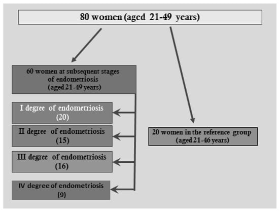 The study included 80 women aged 21–49 years (mean age 31.3 ± 6.7 years) undergoing laparoscopy to determine the causes of primary infertility. The examined women were patients of the Department and Clinical Ward of Gynaecology and Obstetrics, Professor K. Gibiński University Clinical Centre, Medical University of Silesia in Katowice. The inclusion criteria were as follows: written informed consent to participate in the study, regular menstrual cycles lasting 28 ± 4 days, general good health, diagnosis of primary infertility, no history of the use of hormonal substances for 3 months before laparoscopy, no history of autoimmune diseases, as well as benign or malignant lesions in the ovaries and the uterus. The exclusion criteria were as follows: failure to deliver written consent to participate in the study, irregular menstrual cycles (not lasting 28 ± 4 days), history of immunomodulators, hormonal medication, general poor health, non-malignant or malignant changes in the ovaries or the uterus. In total, 60 women aged 21–49 years (mean age 31.9 ± 7.0 years) were enrolled in the study group; among them, endometriosis in the small pelvis was diagnosed during laparoscopy and then confirmed by histopathological examination. The extent and severity of endometrial changes in the peritoneal cavity were evaluated according to the classification of the American Society of Fertility (rAFS), including the division into stages I, II, III, and IV of endometriosis. In total, 20 women were at the first stage of endometriosis, 16 women at stage II, 15 women at stage III, and 9 women were diagnosed at stage IV. The reference group consisted of 20 women aged 21–46 years (mean age, 30.4 ± 6.1 years), who had no endometriosis or other pathological changes observed in the small pelvis region during laparoscopy. All of the women were informed about the purpose of the research and they expressed their consent for the collection and use of their peritoneal fluid for scientific purposes. Approval was granted by the Bioethics Committee of the Medical University of Silesia in Katowice, No. KNW-6501-57/07, for the tests. The test material was the peritoneal fluid collected during laparoscopy from women in the proliferative phase of the menstrual cycle. Immediately after collection, the peritoneal fluid was centrifuged at 2500 rpm for 10 min at 4 °C, to separate the fluid from the cells. After centrifugation, the supernatant was divided into small portions and stored at −80 °C until the assays were made.