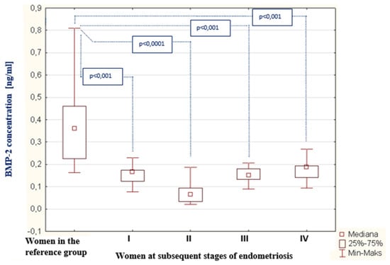 In the peritoneal fluid of women with endometriosis, BMP-2 concentration decreased, in comparison with the concentration of this parameter in the reference group (p < 0.0001). The average BMP-2 concentration among women with endometriosis was 0.14 ng/mL (Q1: 0.09 and Q3: 0.18), and in the reference group: 0.36 ng/mL (Q1: 0.46 and Q3: 1.66). The concentration of BMP-2 in the peritoneal fluid of women with subsequent degrees of endometriosis and in the reference group is shown in Figure 3. The analysis of the results demonstrated a statistically significant decrease in the BMP-2 concentration in the fluid of women at stage II of endometriosis, compared to the concentration of this parameter among women at stage I (p < 0.05). In the group of women with stage III endometriosis, the concentration of BMP-2 demonstrated a statistically significant increase compared to the concentration of this parameter in the fluid of women at stage II (p < 0.05). In the fourth stage of endometriosis, the BMP-2 concentration reached the highest value; however, compared to the concentration of this parameter in the peritoneal fluid of women at the third stage of endometriosis, this was not a statistically significant change. In the 4th stage of endometriosis, the BMP-2 concentration reached the highest value, however, comparing to the concentration of this parameter in the peritoneal fluid of women with the 3rd degree of endometriosis, this was not a statistically significant change. There was no statistically significant correlation between BMP-2 concentration and the degree of endometriosis.