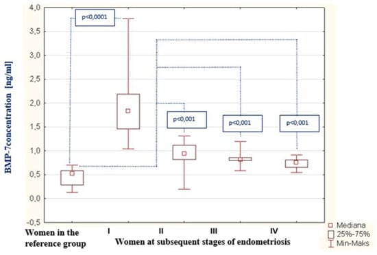 BMP-7 concentration in the peritoneal fluid of women at subsequent stages of endometriosis and women in the reference group.