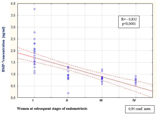 As a result of the tests carried out in the peritoneal fluid of women with endometriosis, a statistically significant increase in BMP-7 concentration was found compared to the concentration of this protein among women from the reference group (p < 0.0001). The average concentration of BMP-7 among women with endometriosis was 0.93 ng/mL (Q1: 0.81 and Q3: 1.46), and in the reference group, this was 0.52 ng/mL (Q1: 0.28 and Q3: 0.59). The concentrations of BMP-7 in the peritoneal fluid of women with subsequent degrees of endometriosis, and in the reference group, are shown in Figure 4. The analysis of the results showed a statistically significant decrease in BMP-7 concentration in the second stage of endometriosis compared to the concentration of this protein among women with the first stage of the disease (p < 0.0001). A statistically insignificant decrease in BMP-7 concentration was found among women with stage III endometriosis compared to the level of this parameter in the fluid of women at stage II of the disease. A statistically insignificant decrease in BMP-7 was demonstrated among women at stage IV of endometriosis compared to the concentration of this parameter among women at stage III of the disease and a statistically insignificant decrease in BMP-7 was demonstrated among women with stage I of endometriosis comparing to the concentration of this parameter among women with stage IV of the disease. It was observed that, in the fluid of women with stage IV endometriosis, the concentration of BMP-7 was the lowest in comparison to the concentration of this protein among women at stages III, II and I of the disease. A negative and statistically significant relationship between the concentration of BMP-7 in the peritoneal fluid and the stage of endometriosis (p < 0.0001; R = −0.832) was also proven, which is shown in Figure 5. The analysis of the results did not show a statistically significant relationship between the concentration of bone morphogenetic proteins -2 and -7 in the peritoneal fluid of women with endometriosis.