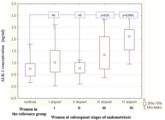 ALK-1 concentration in the peritoneal fluid of women at subsequent stages of endometriosis and women in the reference group.