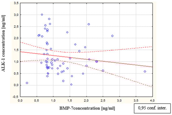 As a result of the tests carried out in the peritoneal fluid of women with endometriosis, a statistically significant increase was observed in the concentration of ALK-1 in the peritoneal fluid of women with endometriosis, compared to the concentration of this parameter in the reference group (p < 0.0001). The average concentration of ALK-1 in women with endometriosis was 1.01 ng/mL (Q1: 0.72 and Q3: 1.75); in the reference group, this was 0.75 ng/mL (Q1: 0.44 and Q3: 0.96). The concentrations of ALK-1 in the peritoneal fluid of women with subsequent degrees of endometriosis and in the reference group are shown in Figure 6. The analysis of the results demonstrated a statistically significant decrease in BMP-7 concentration at the second stage of endometriosis, compared to the concentration of this protein in women at the first stage of the disease (p < 0.0001). A statistically insignificant decrease in BMP-7 concentration was found in women at stage III endometriosis compared to the level of this parameter in the fluid of women at stage II of the disease. A statistically insignificant decrease in BMP-7 concentration was also observed in women at stage IV endometriosis compared to the concentration of this parameter in women at stage III of the disease. It was observed that, in the fluid of women with stage IV endometriosis, the concentration of BMP-7 was the lowest, compared to the concentration of this protein in women at stages III, II, and I of the disease. In addition, it was shown that there is no statistically significant relationship between the concentration of the ALK-1 receptor in peritoneal fluid and the concentration of bone-2 morphogenetic protein in the peritoneal fluid of women with endometriosis. In contrast, a negative statistically significant relationship was observed between the concentrations of ALK-1 receptor in peritoneal fluid and bone morphogenetic protein-7 in women with endometriosis (p < 0.01; R = −0.254). A linear regression curve illustrating this relationship is shown in Figure 7.