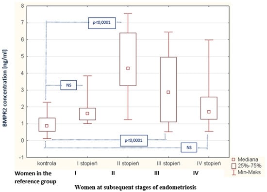 BMPR2 concentration in the peritoneal fluid of women at subsequent stages of endometriosis and women in the reference group.