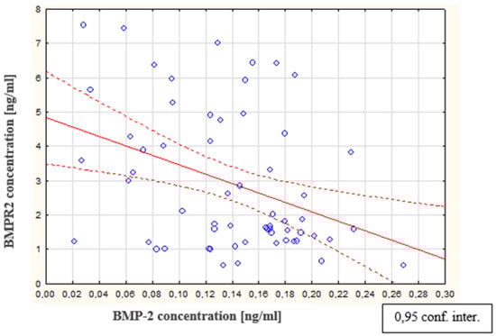 As a result of the tests performed in the peritoneal fluid of women with endometriosis, a statistically significant increase in BMPR2 concentration in the peritoneal fluid of women with endometriosis was found, compared to the concentration of this parameter in the reference group (p < 0.0001). The average concentration of BMPR2 in women with endometriosis was 1.87 ng/mL (Q1: 1.27 and Q3: 4.34), and in the reference group, this was 0.87 ng/mL (Q1: 0.55 and Q3: 1.36). The concentrations of BMPR2 in the peritoneal fluid of women with subsequent degrees of endometriosis and in the reference group are shown in Figure 8. The analysis of the results demonstrates a statistically significant increase in BMPR2 concentration in the fluid of women at stage II of endometriosis, compared to the concentration of this receptor in women at stage I (p < 0.0001). It is worth emphasizing that, in women at the first stage of endometriosis, the BMPR2 concentration was the lowest while, in those at the second stage of the disease, the level of the examined receptor reached the highest value. It was also observed that, at the third stage of endometriosis, the concentration of BMPR2 demonstrated a statistically significant decrease compared to the concentration in the fluid of women at the second stage of the disease (p <0.0001). However, in women at the fourth stage of endometriosis, the concentration of the studied parameter decreased compared to the concentration in those at the third stage of endometriosis, and this was not a statistically significant change. It was also shown that there is no statistically significant relationship between the concentration of the BMPR2 receptor and the concentration of bone morphogenetic protein 7 in the peritoneal fluid of women with endometriosis. In addition, no statistically significant correlation was found between the type-II receptor concentration for BMPR2 and the type I receptor concentration for ALK-1. In contrast, a negative statistically significant relationship between BMPR2 receptor concentration and bone morphogenetic protein 2 concentration (p < 0.01; R = −0.291) is shown in Figure 9.