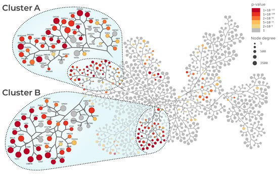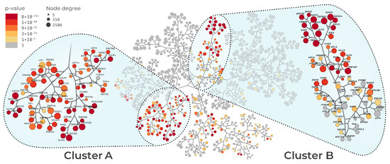Tree-and-leaf representation of the Pediatric Sepsis 1 (GSE13904) regulatory network. Nodes represent regulatory units (i.e., regulons) labeled after their transcription factors. Node size represents regulon connectivity with regulated genes (degree); node color represents adjusted p-value (FDR < 0.01) of MR enrichment for sepsis condition. Dotted lines denote the two main connected clusters of regulons, cluster A and B.