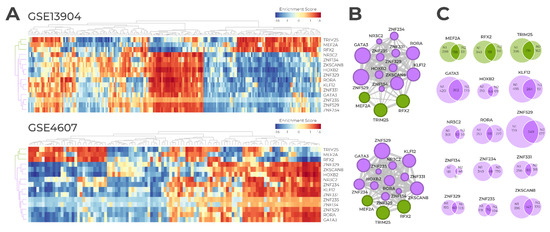 (A) Heatmaps showing the regulatory activity of the 15 master regulators in both the Pediatric Sepsis 1 cohort (GSE13904) and Pediatric Sepsis 2 cohort (GSE4607). Y-axis shows the 15 regulons and X-axis shows all samples in each dataset (99 and 108 septic samples in the datasets GSE13904 and GSE4607, respectively). The color code indicates regulon activity, being red when a regulon is activated in a given sample and blue when a regulon is inhibited in a given sample. (B) Association map network, showing the connection between the regulons. Nodes represent regulons, and the node widths are proportional to the number of mutual target genes between each two transcription factors. (C) Venn diagrams showing the number of genes in each of the 15 regulons, and the regulon similarity comparing Pediatric Sepsis 1 and 2 datasets.