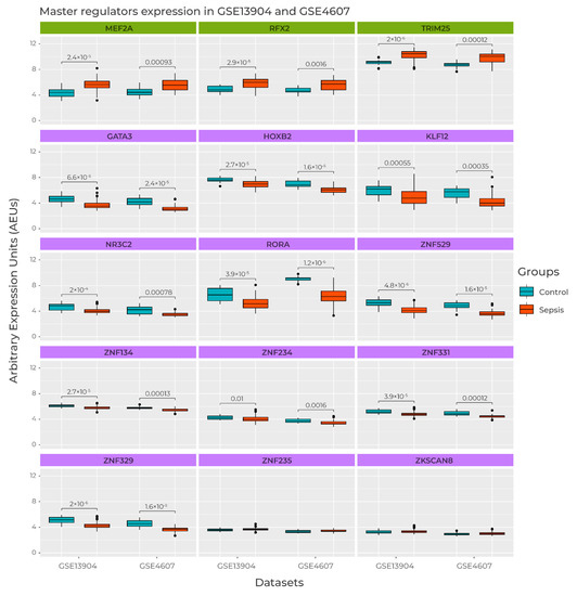Pediatric sepsis is a genuine Pandora’s box regarding its complexity. It is a challenging acute syndrome that quickly evolves into life-threatening scenarios and the establishment of new reliable prognostic and predictive biomarkers remains necessary [12]. Identifying regulatory mechanisms of this clinical condition could help the search for specific traits indicating disease status [39]. The natural variation within individuals may lead to different outcomes despite identical protocols and treatments [40]. Symptoms of pediatric sepsis are often dependent on subject age, sepsis type, sepsis duration, and etiological agent. Here, we used expression data from two independent cohorts to reconstruct the pediatric sepsis regulatory networks. We identified the same 15 MRs in both cohorts, the composition of those MRs were similar in both cohorts, as well as the MRs activity, and the MRs expression in pediatric septic patients. There are hundreds of biomarkers associated with sepsis, but very few (e.g., C reactive protein and procalcitonin) are currently used as a clinical routine, indicating that we might lack knowledge about how sepsis regulates gene expression [41]. Previous studies using the same datasets used here identified alterations in zinc ion homeostasis and enhanced interleukin-8 and metallothioneins (MT) expression [6]. Authors also identified IL-27 as a diagnostic biomarker for bacterial infection in critically ill children, which was further validated in independent datasets [23,24,25,29].