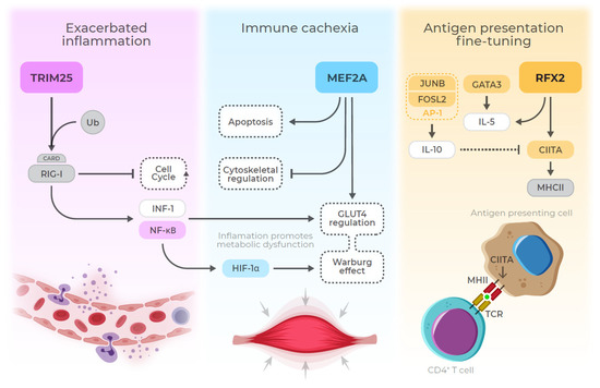 Our results give direction on how sepsis master regulators work coordinately in disease progression, especially MEF2A, TRIM25, and RFX2, with potential implications in pediatric sepsis prognosis. Additionally, the presented results shed light on MRs that are more specific to sepsis progression. This three-TF regulating axis might act in three steps: exacerbated inflammation (TRIM25) associated with septic cachexia (MEF2A) and “fine-tuning” of antigen presentation (RFX2) (Figure 7). This three-TF axis has not been directly linked to sepsis in the literature, except by MEF2A [52]. Therefore, more studies are needed to better understand how inflammatory response MRs and pediatric sepsis MRs correlate. Further research evaluating the association between regulon activity or the MRS expression and clinical aspects could help elucidate the role of such TFs in pediatric sepsis progression. The lack of studies on sepsis treatments targeting these TFs and their genes opens up new perspectives of investigation for this critical condition.