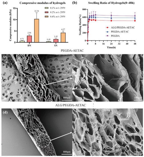 (a) Compressive modulus of different hydrogels. (b) Swelling ratio of different hydrogels. SEM images of (c) PEGDA-AETAC hydrogel and (d) ALG/PEGDA-AETAC hydrogel.