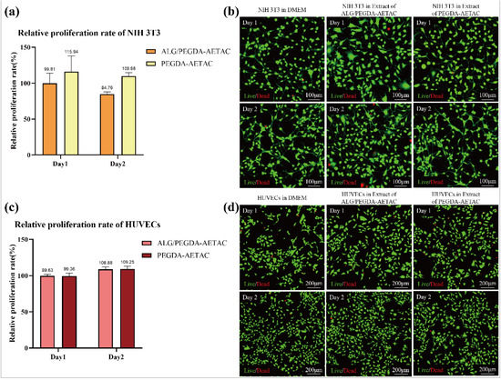 (a) The relative proliferation rate of NIH 3T3 cells in the extracts of ALG/PEGDA-AETAC and PEGDA-AETAC. (b) Live/dead staining images of NIH 3T3 cells after 24 h and 48 h of culture in culture medium, ALG/PEGDA-AETAC hydrogel extract, and PEGDA-AETAC hydrogel extract. (c) The relative proliferation rate of HUVECs in the extracts of ALG/PEGDA-AETAC and PEGDA-AETAC. (d) Live/dead staining images of HUVECs after 24 h and 48 h of culture in culture medium, ALG/PEGDA-AETAC hydrogel extract, and PEGDA-AETAC hydrogel extract.