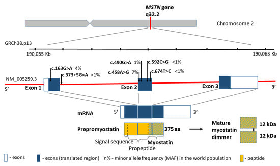The myostatin gene (MSTN, also referred to as the growth differentiation factor 8, GDF8; MIM601788), encodes a skeletal muscle-specific secreted preproprotein, which is proteolytically processed to generate each subunit of the disulphide-linked homodimer []. Moreover, myostatin is a highly conserved member of the transforming growth factor-β superfamily, which is expressed mostly in the muscle tissue, and negatively regulates skeletal muscle cell proliferation and differentiation. Thus, mutations in MSTN gene are associated with an increased skeletal muscle mass in humans and other mammals []. One example is splicing variant c.373+5G>A (rs397515373), which causes large muscle hypertrophy and unusual strength in children with the homozygous variant [].