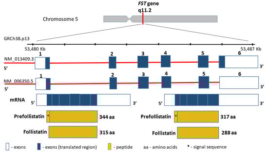 The follistatin gene (FST, MIM136470), encoding a highly conserved among the species cysteine-rich monomeric glycoprotein, is located on chromosome 5 (5q11.2), contains 6797 bp between coordinates 53,480,338 and 53,487,134 bp (GRCh38.p13), and comprises six exons (Figure 3). The follistatin, similarly to myostatin, is included in the TGF-beta superfamily. Moreover, the product of the FST gene is synthesized as pre-follistatin in isoforms 344 and 317 amino acids depending on the transcript, which differs in length at the C-terminus []. The mature protein was formed following the cleavage of the signal peptide (29 amino acids) (Figure 3). Different genetic variants of the FST gene have been described in the literature, such as the coding region, e.g., rs11745088 (c.454G>C, p.E152Q) and rs1127760 (c.715T>A, p.C239S). However, they were analysed in the context of susceptibility to polycystic ovarian syndrome (POS)) [,], or premature ovarian failure (POF) []. This line of research results from linkage and association studies [], as well as from animal studies, which suggest that the FST loss may result in a premature ovarian cessation []. Further results are controversial, since some support this thesis [], whereas other studies found no evidence that FST is a POS or POF disease-causing gene [,]. In terms of sarcopenia, the intronic variants rs3797297 (c.85+950G>T), rs3756498 (c.86−500G>A), rs12152850 (c.721+230C>T), and rs12153205 (c.722−241T>C) in the FST gene have all been investigated to date, and comprise a haplotype block []. The obtained data have demonstrated that FST loci may contribute to the interindividual variation in both skeletal muscle mass and strength in men, but not in women []. However, similar studies of FST gene variants have not been conducted so far.